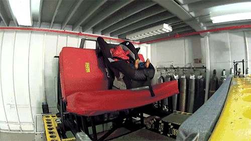 这组实验是在时速30英里(约48公里)的速度下进行的,结果可以看出,发生碰撞时,身穿羽绒服的假人娃娃直接从安全座椅中“飞”了出来。