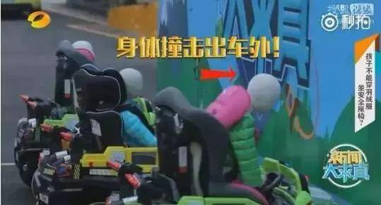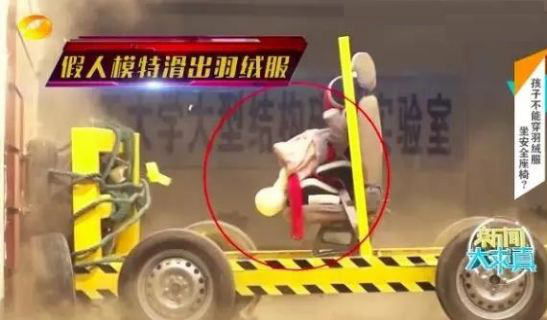 原来,羽绒服是蓬松状的,里面有很多空气填充。当发生碰撞时,厚实的衣服在强大的碰撞力量下,被压缩得急速变形。原来的填充空间瞬间释放出来,安全座椅上的安全带就会突然变松。