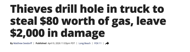 这类犯罪的抬头,与近期油价上涨密切相关。根据美国汽车协会的数据,目前全美平均油价约为每加仑4.09美元,尽管较前一周略有回落,但仍比去年同期高出约92美分。而在加州,平均油价更是达到约5.85美元/加仑,在洛杉矶部分地区甚至突破6美元大关。