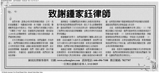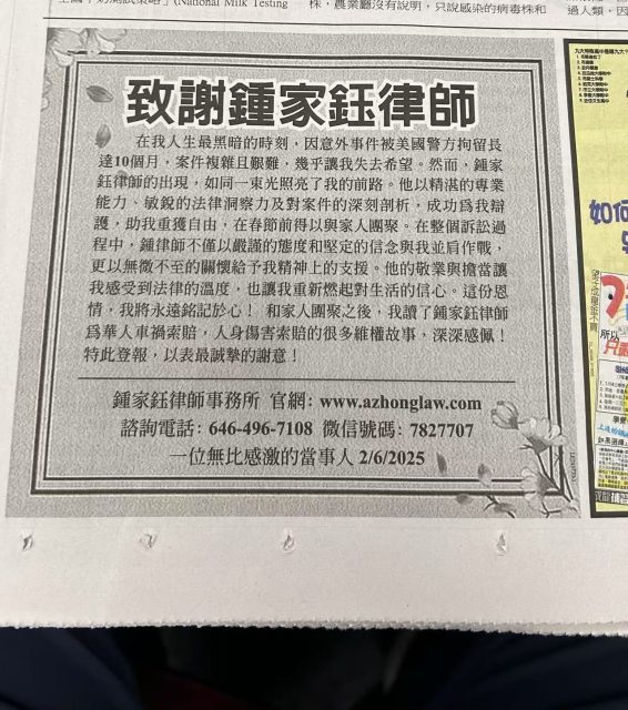 2025年2月,两封刊登在《世界日报》上《致谢钟家钰律师》的感谢信引起了我们的关注。于是我们向钟家钰律师和感谢信的作者了解到了此事更细节的经过,并分享给广大读者。