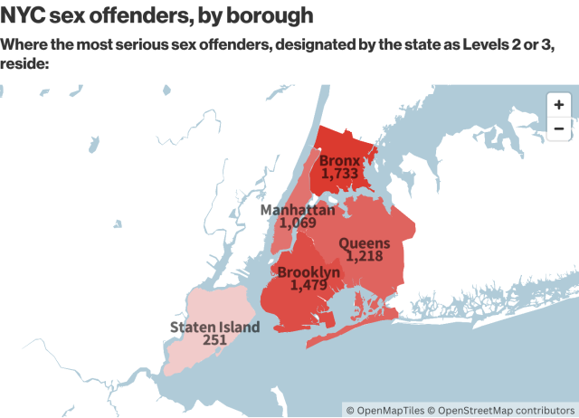 据《纽约邮报》对州性犯罪者登记册的分析显示,共有5750名二级和三级性犯罪者(三级性犯罪者中级别最高的)居住在纽约市五大区。该登记册每日更新。