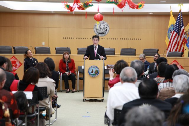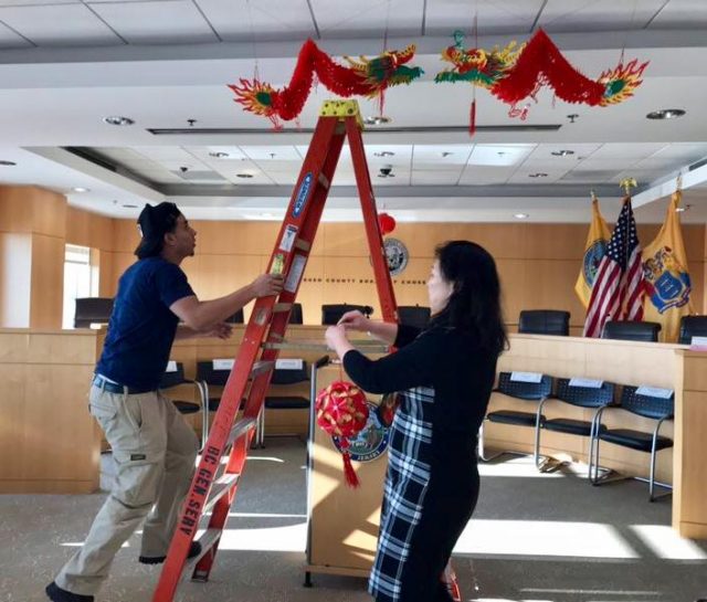 2019年3月5日,在Bergen County 的政府大楼举办了农历已亥猪年的庆祝活动。当天会议大厅被红红的灯笼,美丽吉庆的中国结,大红福字,生肖挂件等等装点得喜庆热烈。