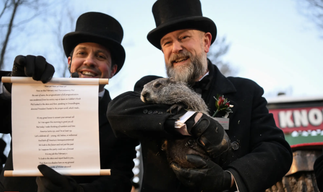 与此同时,在宾夕法尼亚州杰斐逊县的庞克苏托尼(Punxsutawney)小镇,气氛同样火热。清晨,在戈布勒斯诺布(Gobbler’s Knob),数万名狂欢者冒着零下1摄氏度的严寒等待菲尔的现身。一名身穿黑色外套、头戴高礼帽的男子将菲尔高高举起——它看到了自己的影子,意味着冬天仍未结束。