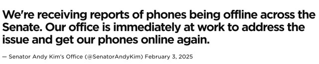 Kim的办公室在X上表示,他们接到报告称所有参议院的电话都无法使用,公众无法通过电话与民选官员取得联系。“我们的办公室马上开始处理这个问题,让我们的电话系统重新上线。”该声明迅速引发关注,不少网友质疑这是否与近期马斯克主导的政府机构调整有关。