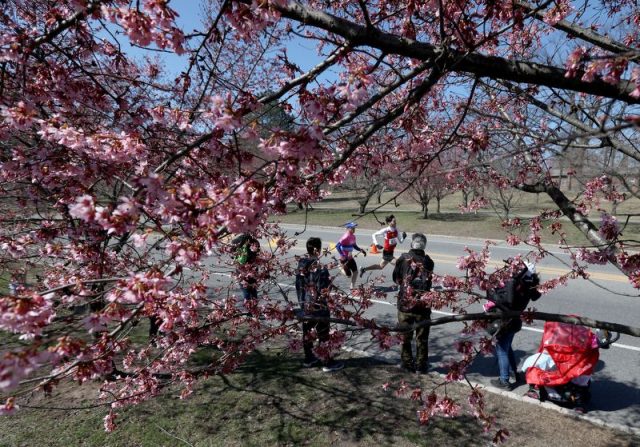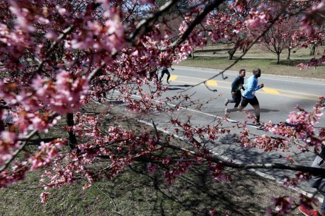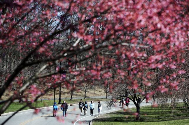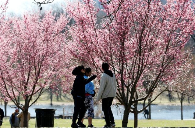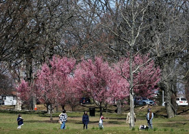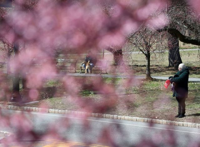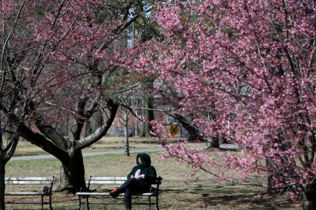 周日,新泽西州艾塞克斯县纽瓦克的布鲁克公园,樱花已经在枝头上悄然绽放,虽然春寒料峭,市民们早已按耐不住,纷纷前往赏花游乐。
