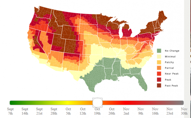 田纳西州-北卡罗来纳州边界阿巴拉契亚山脉的旅游网站SmokyMountains.com-将2019年全美秋叶预报汇总为一张互动地图。(以下为截图)