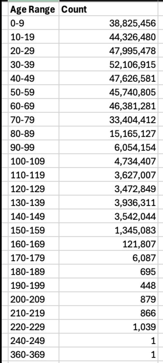 马斯克在X上发布了一张图表,显示美国社会保障数据库中年龄超过100岁的人数高达2000多万。其中,130至139岁年龄段的有390多万人,140至149岁年龄段的有350多万人,150至159岁年龄段的有130多万人。更令人难以置信的是,数据库中还有一位年龄在360至369岁之间的“健在”公民。