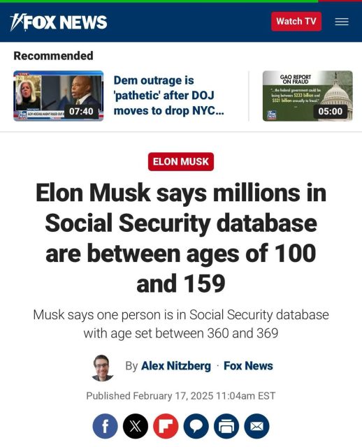 在马斯克的揭露之后,政府效率部(DOGE)已紧急展开调查,以查明纳税人资金的浪费情况。马斯克在新闻发布会上表示:“重新审查社会保障——我们里面有150岁的人。现在你知道有谁年满150岁了吗?他们应该被载入吉尼斯世界纪录。”