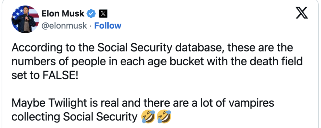 “根据社保数据库,这些是每个年龄段的人数,其中死亡字段设置为FALSE!也许《暮光之城》是真实存在的,而且有很多吸血鬼在领取社保金,”马斯克在帖子中调侃道,并附上了几个笑得满地打滚的表情符号。