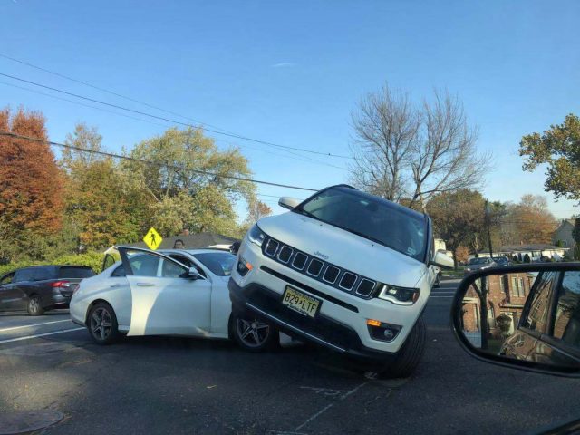 一辆吉普车超速,骑在另一辆小汽车之上。究竟如何发生的,有点匪夷所思。