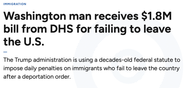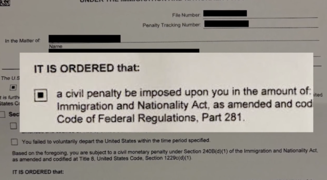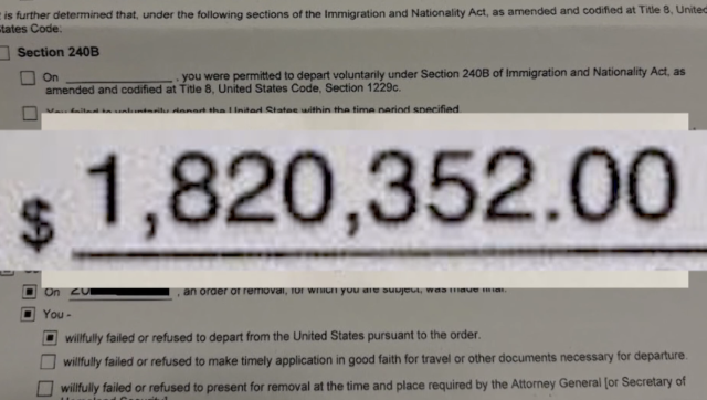 这次巨额罚款的依据来自一项联邦法律。根据规定,如果移民在收到最终驱逐令后仍未离开美国,政府可以对其处以每日罚款。