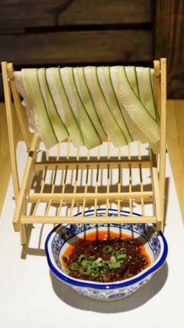 来蜀湘门第,许多客人必点的菜品Number One 是——蒜泥白肉,挂在竹竿上的薄薄的肉片和同样薄的黄瓜片,配上大厨特製的酱汁,口味浓郁却不失去食物本身的味道,这道菜一定是最先空盘的。而且剩下的酱汁,也许你会要打包(可以回家拌面,一绝!)。