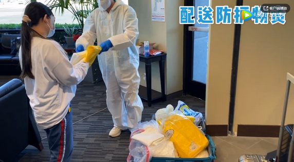工作人员还给大家发放了防护物资,有防护服、护目镜、手套,还准备了消毒湿巾,做好万全准备才能安心登机。