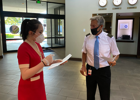 登机前,玥儿仔细和机长Craig沟通,核对各项事宜。