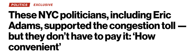 市长埃里克·亚当斯、主计长布拉德·兰德以及公共倡导者朱马内·威廉姆斯等高层官员,由于可以乘坐纽约警察局提供的专车通行,免于支付拥堵费。