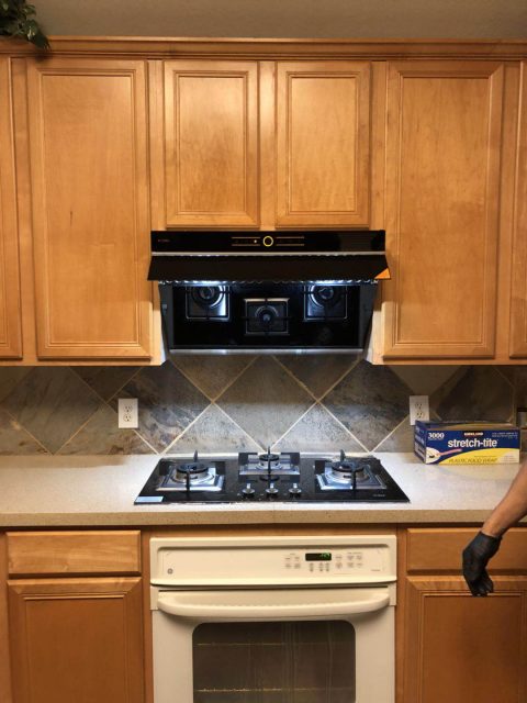 在换装之前,方太安装师傅观察到:用户之前的油烟机容易碰头,不能拢住所有炉头产生的油烟,导致橱柜经常油腻不堪。安装上方太智能油烟机之后,产品的高级质感和暗色调的橱柜完美匹配。