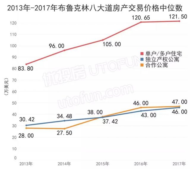 布鲁克林中国城虽然缺少大型新建案,但是因为交通方便,人气足,本身就处于增长的房产周期中。从2013年到2017年的5年间,独户/多户住宅(House)交易价格中位数从83.8万美元增长到了121.5万美元,增幅达到55%,独立产权公寓(Condo)的增长幅度也达到了51.2%。不过从独立产权公寓(Condo)的价格水平来看,还是处于相对较低的水平,缺少高品质的大型住宅。