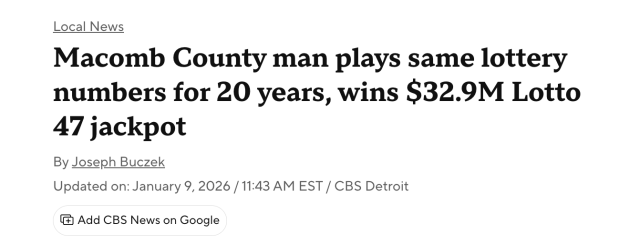 连续20年购买同一组号码,一位来自密歇根州马科姆县(Macomb County)的73岁男子,终于等来了命运的回馈。