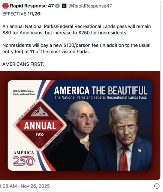 这一举措源于特朗普总统于7月签署的一项行政命令,要求国家公园提高外国游客的门票价格以增加收入。内政部长道格·伯古姆在声明中强调:“特朗普总统的领导始终将美国家庭的利益放在首位。这些政策确保了美国纳税人能够继续享受价格合理的游览服务,同时国际游客也能为维护和改善我们的公园贡献他们应有的份额。”