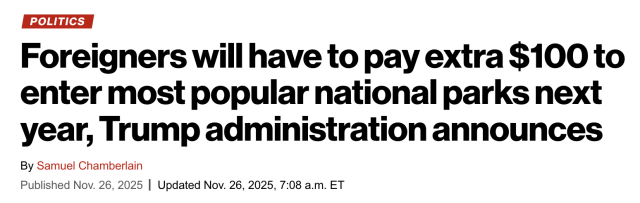 据内政部称,新收费所获资金将用于升级游客设施和进行公园维护。白宫在社交媒体平台X上进一步表示,此举旨在让“美国人享受实惠价格,而外国人支付更高费用”。