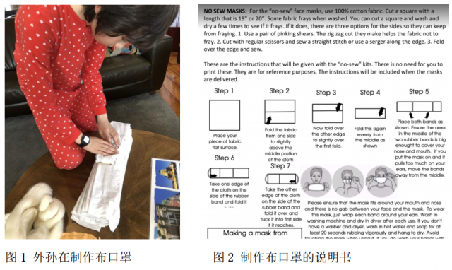 原来这是学校在线上的一堂手工劳作课。老师留给孩子们的家庭作业里有两个选择,一个是做12个不用缝制的布口罩,另一个是做4个用针线缝制的口罩。做完的成品放到学校的邮筒里,由学校收集后统一捐赠给需要这些口罩的养老院和低收入人群。外孙选择了做12个无缝制布口罩,对男孩来说,这个比较容易。