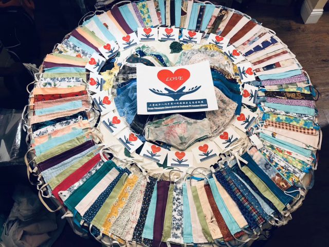 大家白手起家,从零开始。因为所剩善款不多,一切都要靠大家来想办法尽量不花钱少花钱解决。首先是鼓励各家捐赠布料。很多布料都是各家翻箱倒柜从箱子底翻出来的床单,花布。此外,JoAnn布料商店响应州里的号召,对制作捐赠口罩的组织给与免费的布料,大家就分头到JoAnn 的各个分店拿来了一些布料;N95 口罩剪裁有些难度,大家就想方设法找衣厂帮忙。在口罩的缝制过程中,大家都发挥出了最大的积极和能动性,对针脚针线严格要求,技术上面精益求精。为了让口罩带得舒适,巧手妈妈们想了各种办法,系布带,用软T-shirt,用纽扣等等,创意层出不穷。在缝制口罩的过程中,最让人感动的是,很多家庭是全家总动员,不仅有老人们加入,孩子们也跟着学,跟着做,有的中学生在自己做的口罩上点缀上蝴蝶,小花。一只只口罩就像变戏法一样,从无到有,美轮美奂地出现在面前。