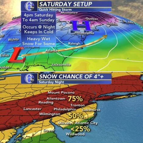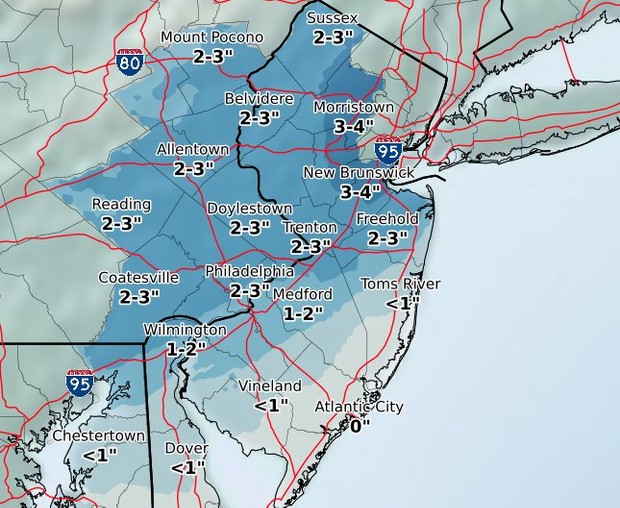 在为周末风暴提供首次与测时,美国国家气象局预计,西部和中部泽西岛会有2到3英寸的积雪,包括苏塞克斯,贝尔维迪尔,特伦顿和弗里霍尔德周围。