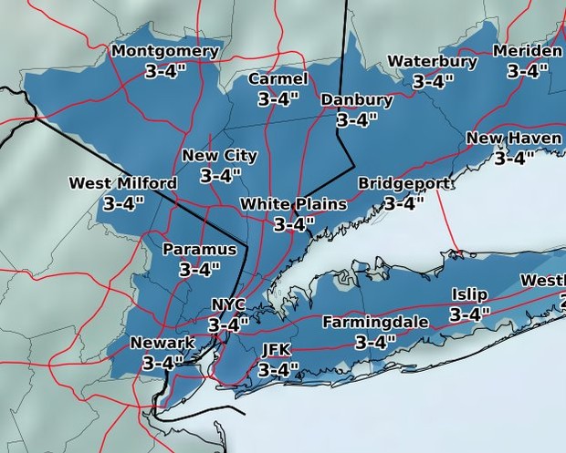 美国国家气象局早期的预报显示新泽西州北部地区的积雪在3至4英寸,包括纽瓦克,帕拉姆斯,西米尔福德和莫里斯敦周围地区。新布伦瑞克地区的降雪也在3至4英寸范围内。