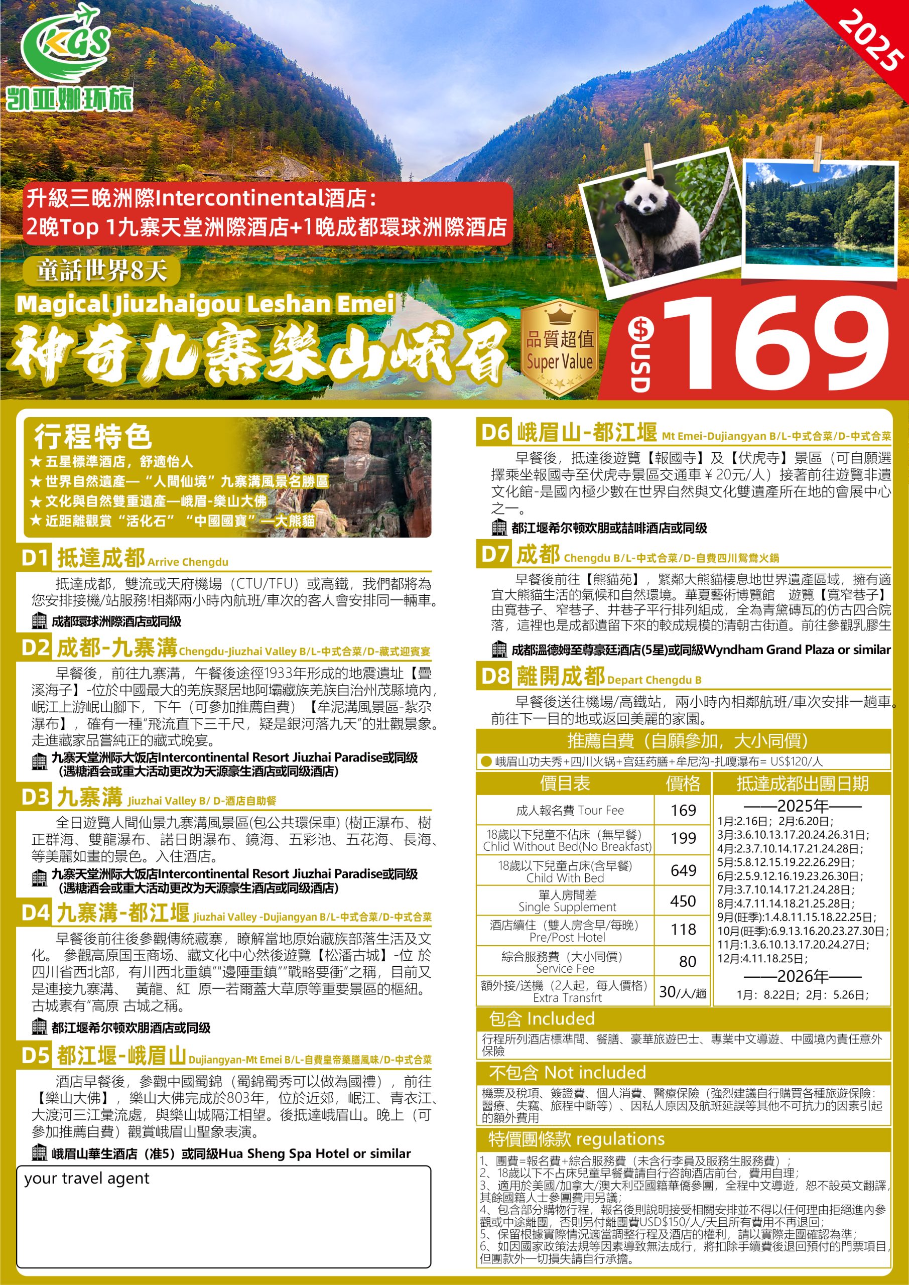 🌹推荐自费项目包括:峨眉功夫秀+四川火锅+宫廷药膳+牟尼沟+扎嘎瀑布,一共$120