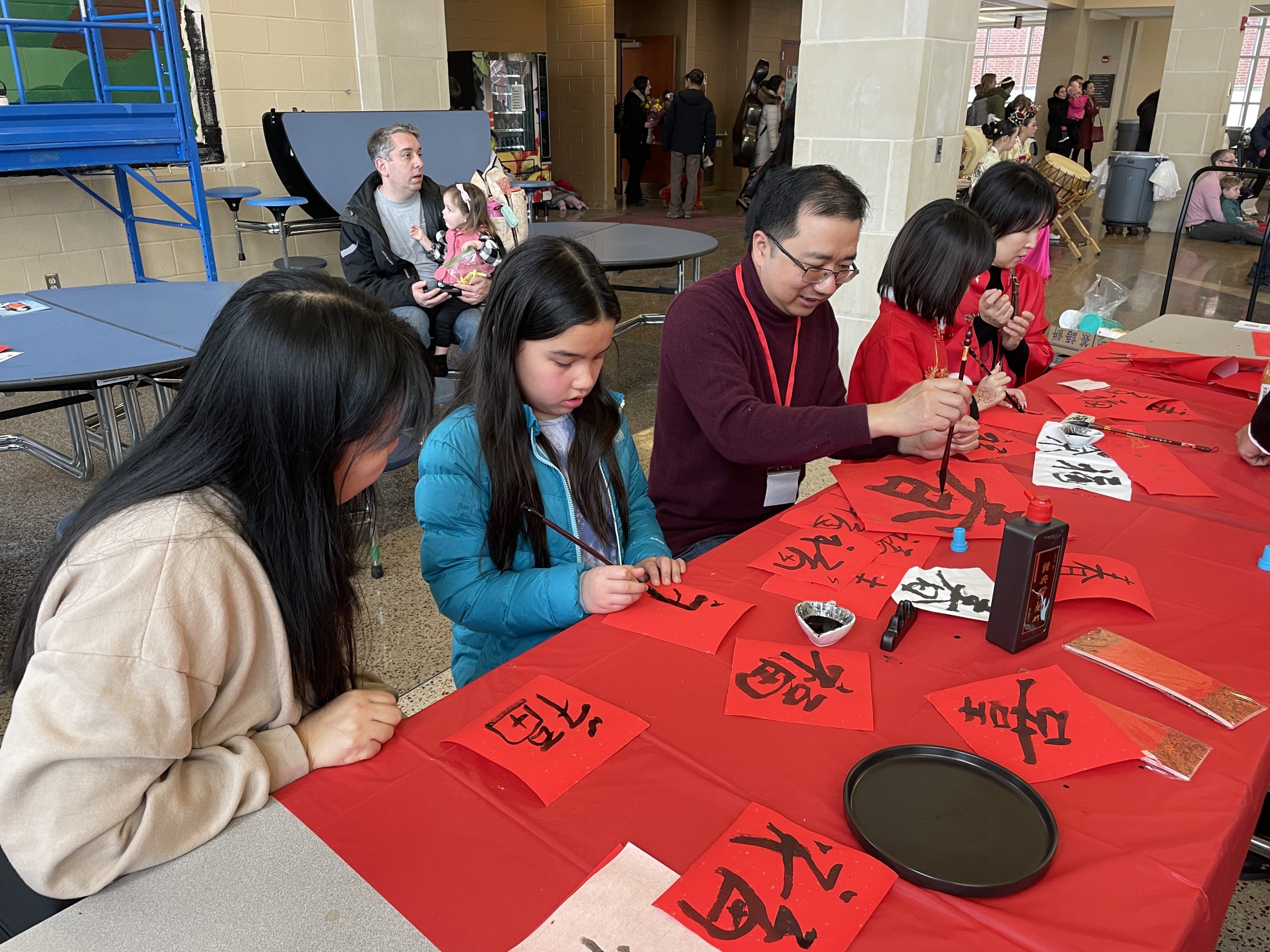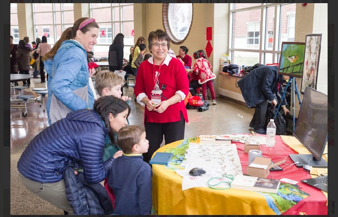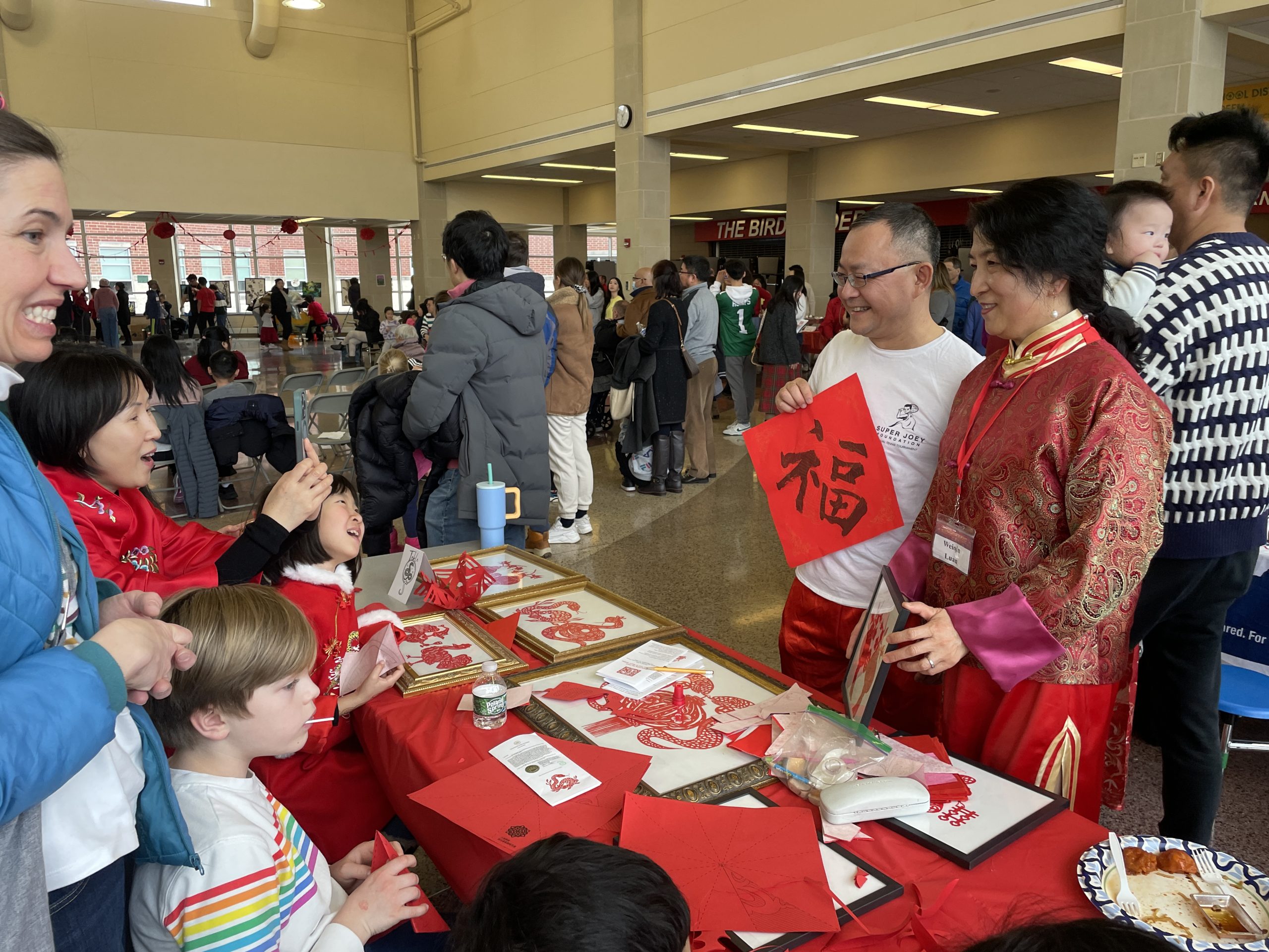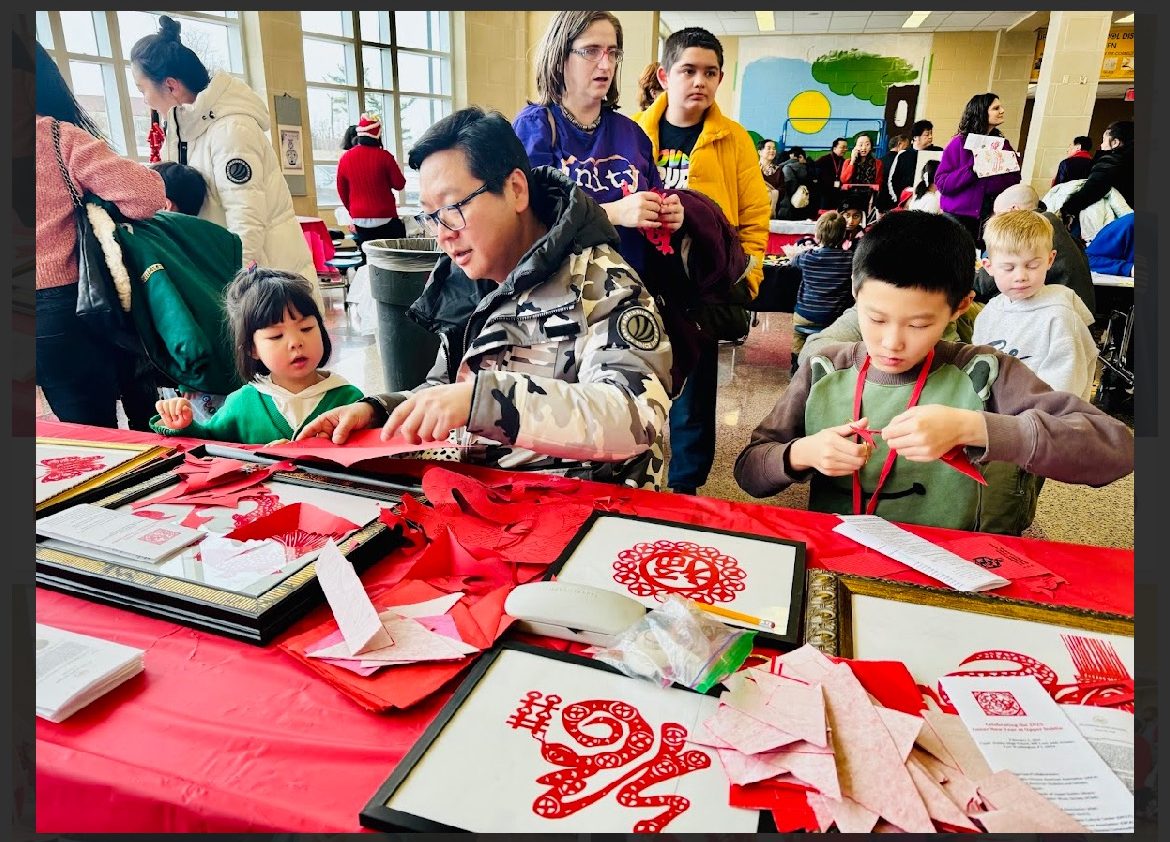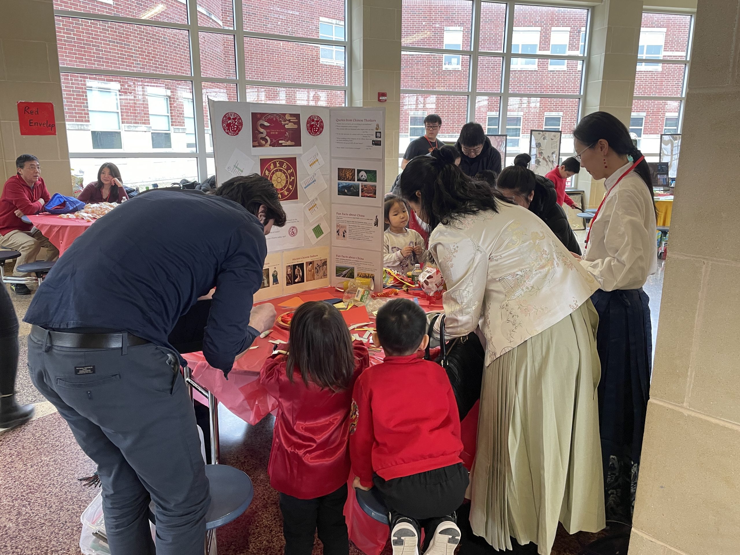 画面二: Upper Dublin高中宽阔的用餐大厅熙熙攘攘,处处都是浓郁的春节气氛。十几个不同主题的文化展台前人头攒动,了解中国历史地理文化,书法,国画,剪纸,折纸,服饰,彩绘,茶艺,参与文化学习和体验,以及参与有趣的互动游戏。小朋友们鞠躬拜年喜洋洋地领取新年红包。