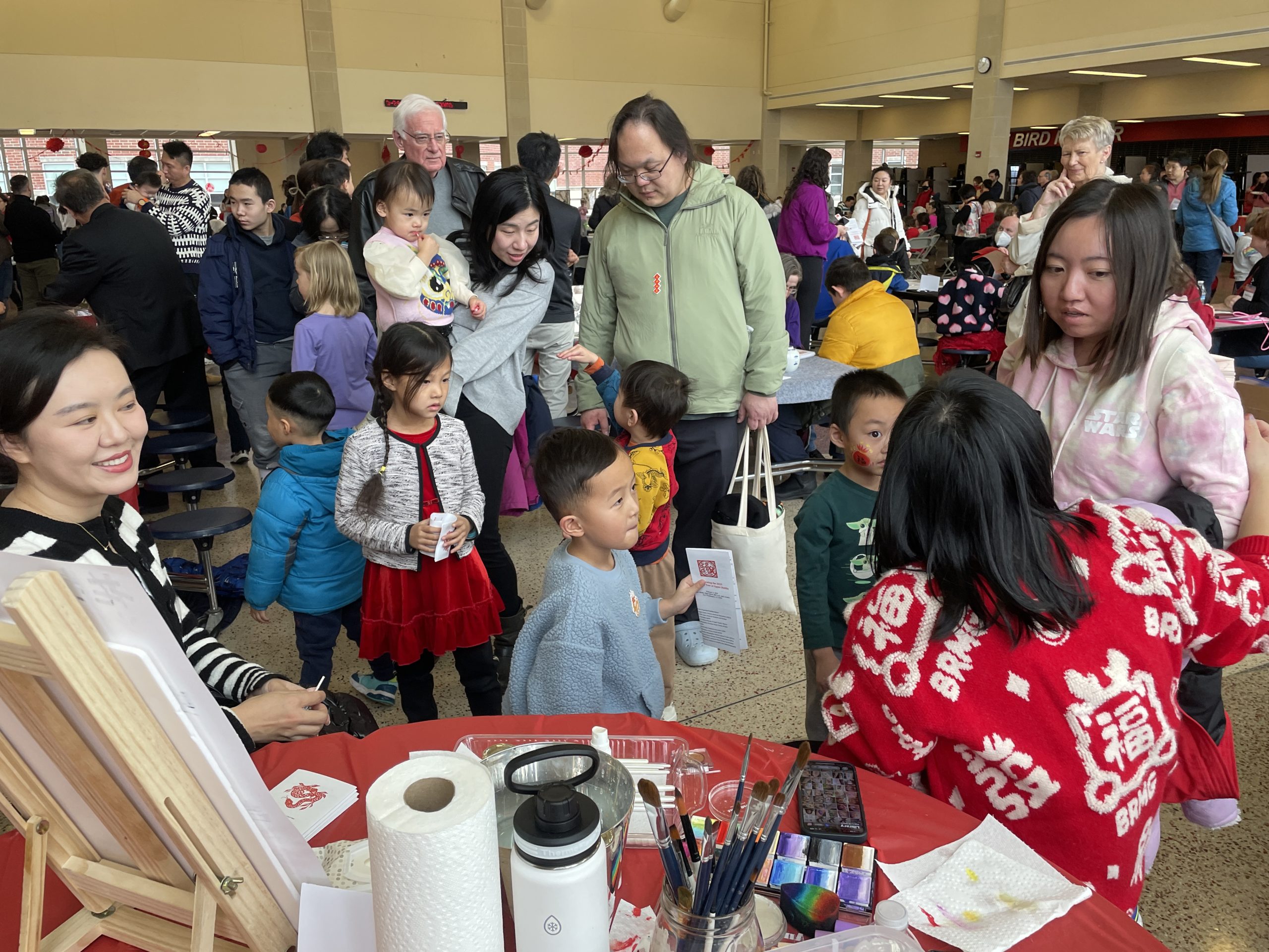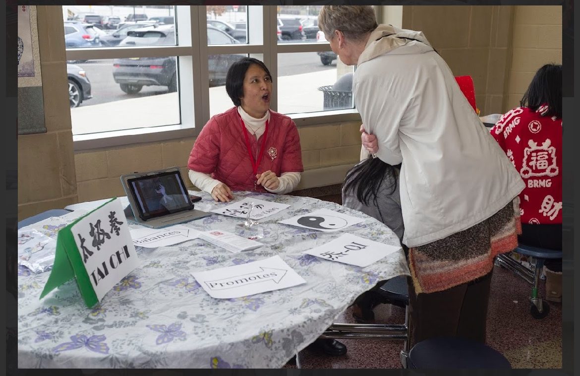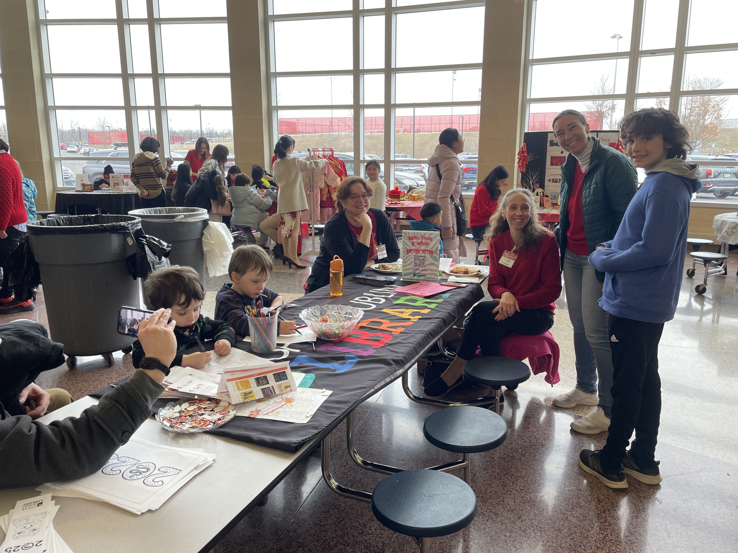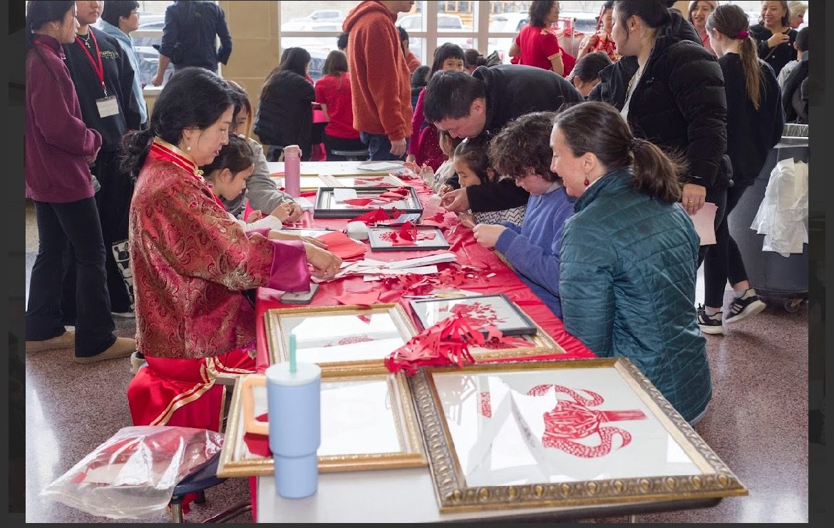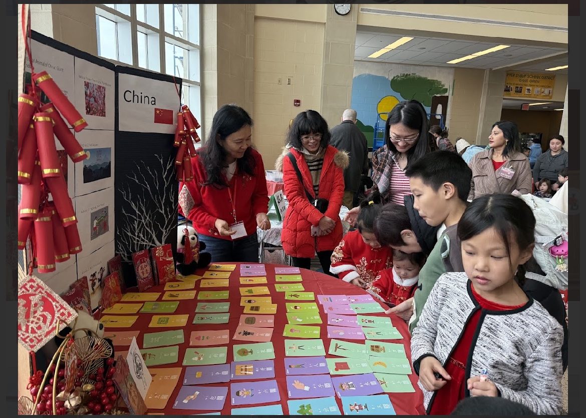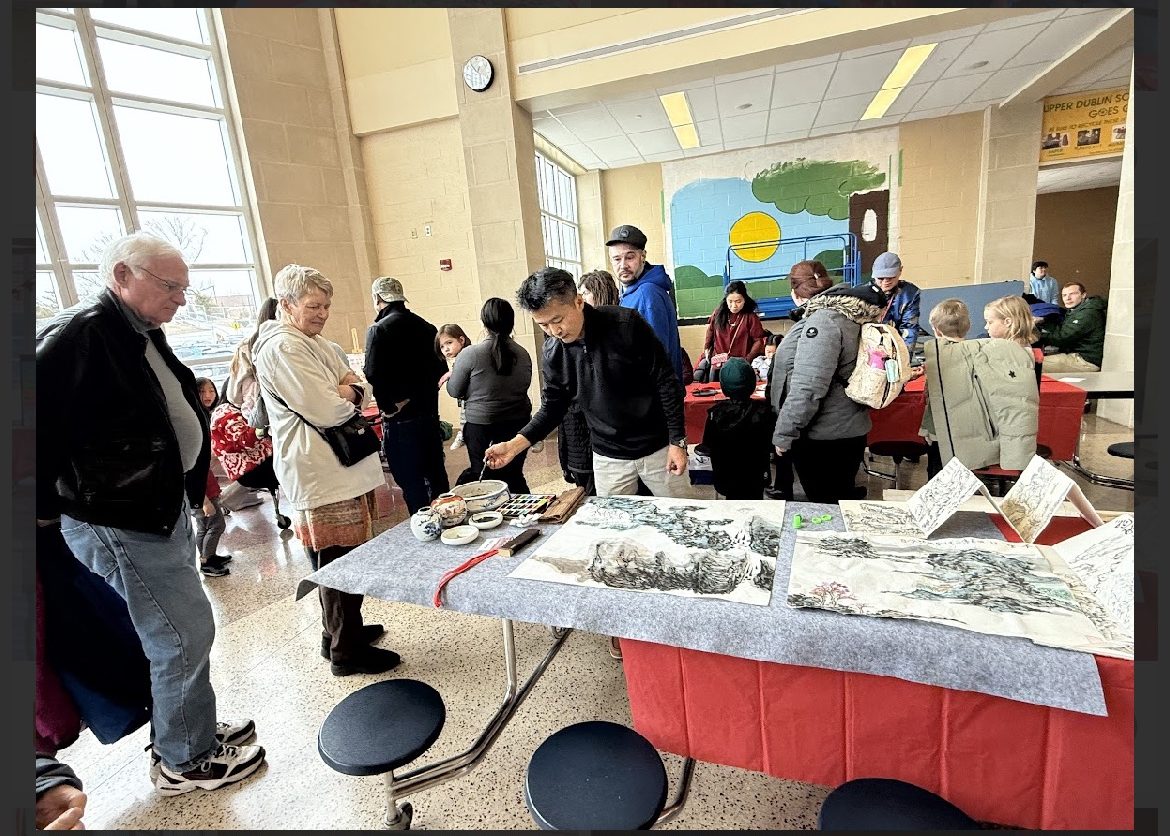画面二: Upper Dublin高中宽阔的用餐大厅熙熙攘攘,处处都是浓郁的春节气氛。十几个不同主题的文化展台前人头攒动,了解中国历史地理文化,书法,国画,剪纸,折纸,服饰,彩绘,茶艺,参与文化学习和体验,以及参与有趣的互动游戏。小朋友们鞠躬拜年喜洋洋地领取新年红包。