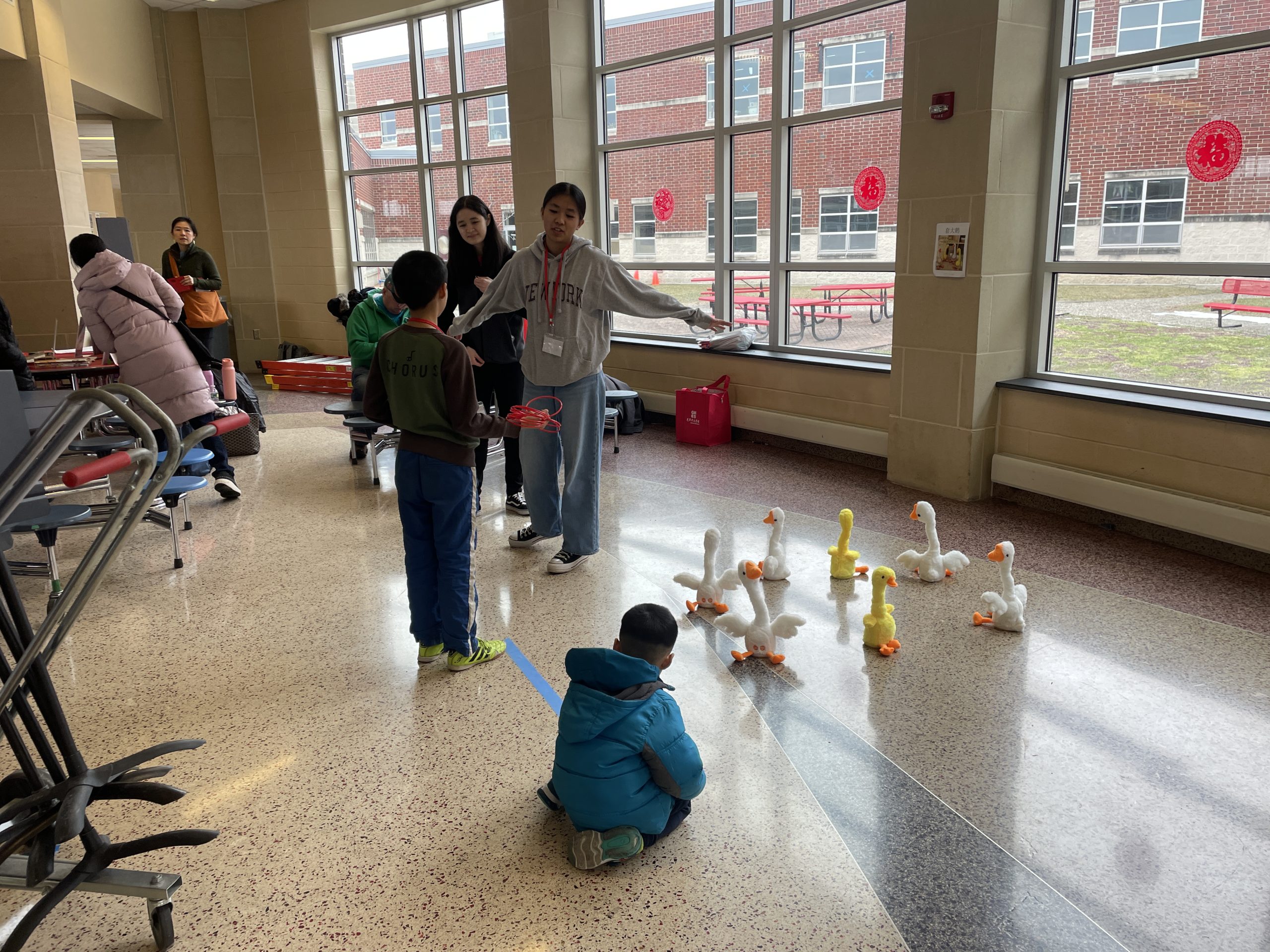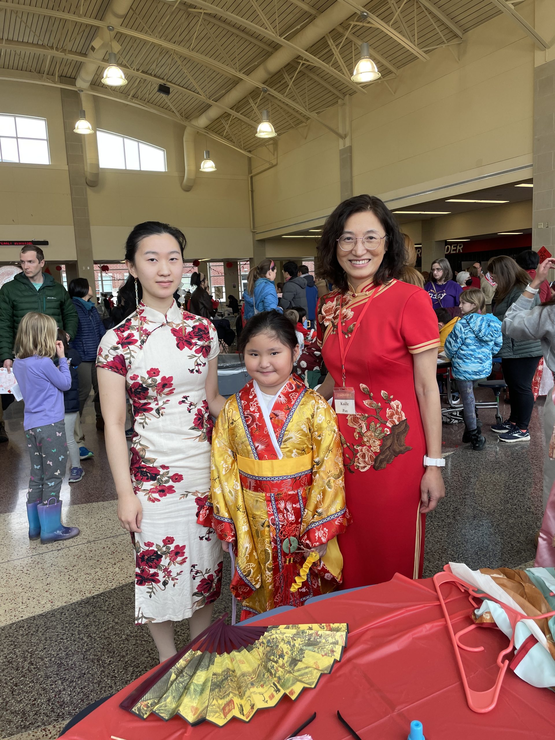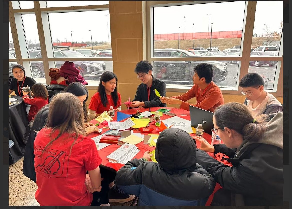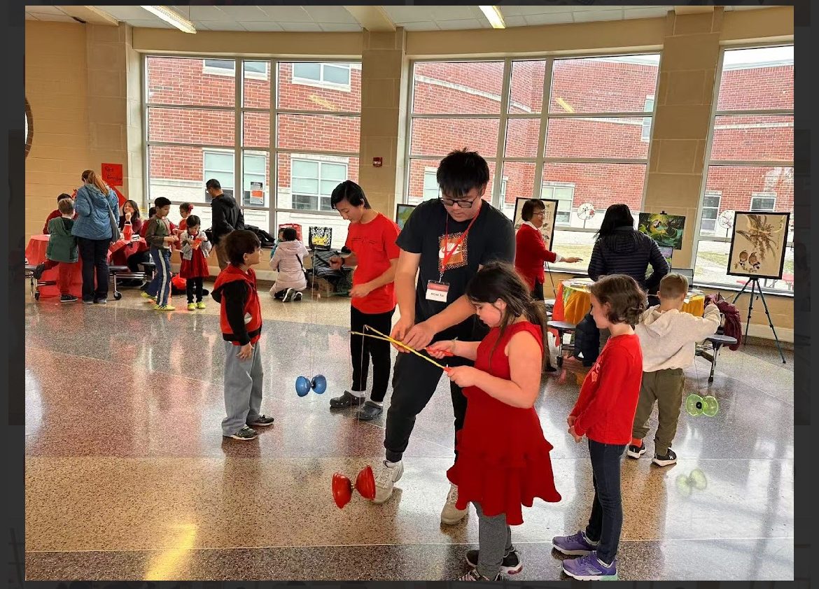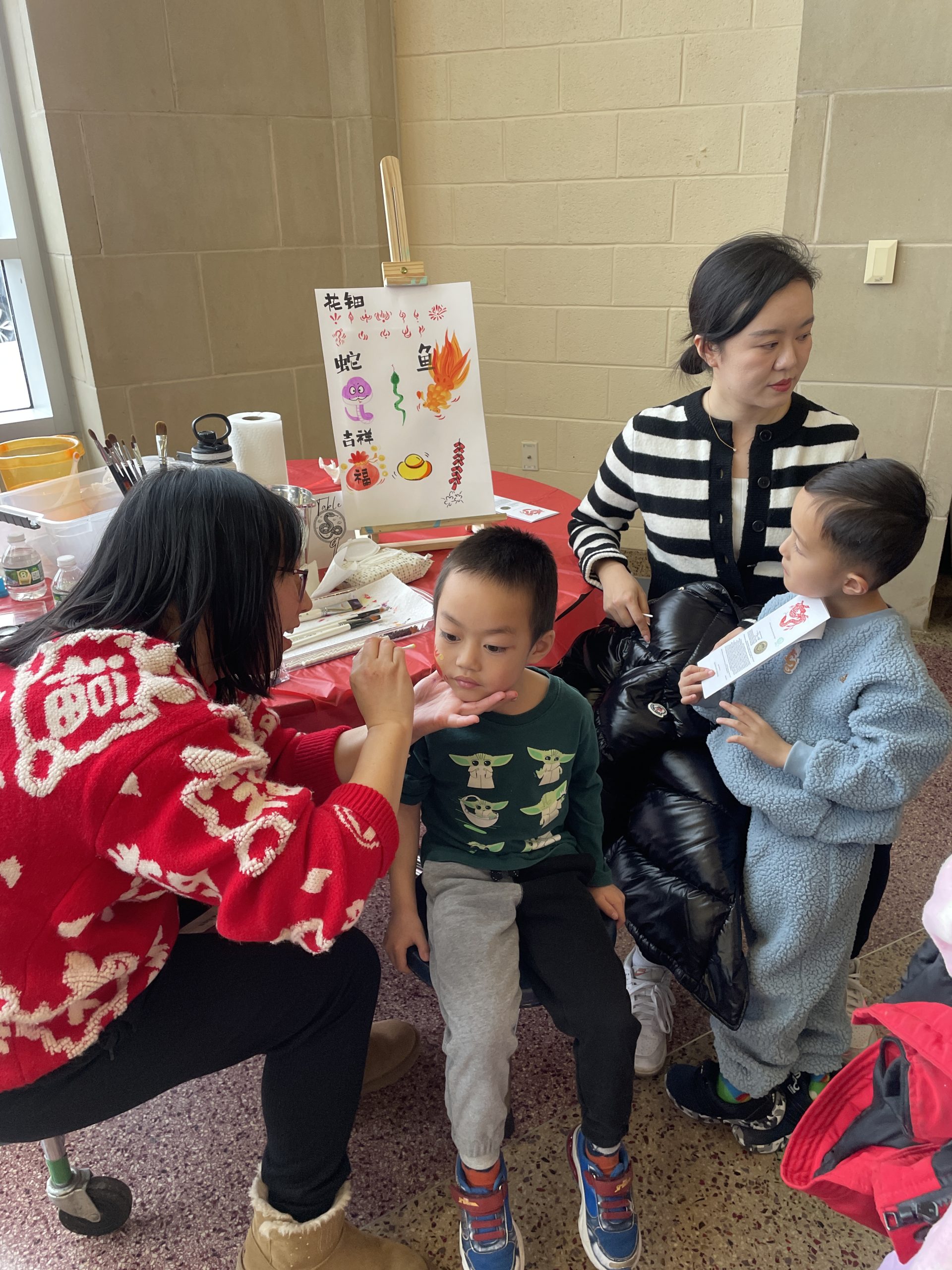 画面二: Upper Dublin高中宽阔的用餐大厅熙熙攘攘,处处都是浓郁的春节气氛。十几个不同主题的文化展台前人头攒动,了解中国历史地理文化,书法,国画,剪纸,折纸,服饰,彩绘,茶艺,参与文化学习和体验,以及参与有趣的互动游戏。小朋友们鞠躬拜年喜洋洋地领取新年红包。