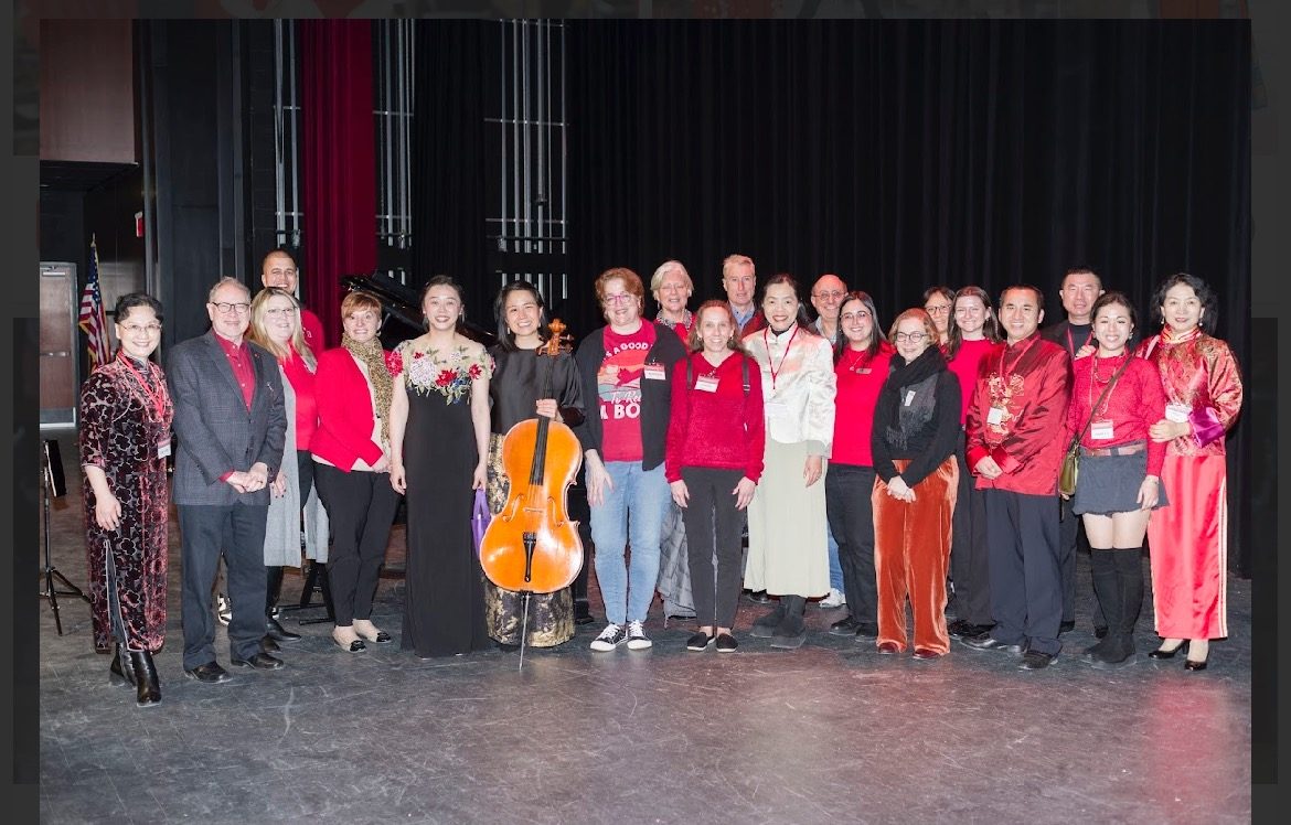 画面一:数百不同族裔的观众坐在Upper Dublin高中优美的表演艺术中心,静静聆听和欣赏由杰出的美国华裔音乐家带来的大提琴和钢琴演奏,沉醉在美妙的、音乐家精彩演绎的、具有中国特色的著名乐曲《新春乐》的合奏中。