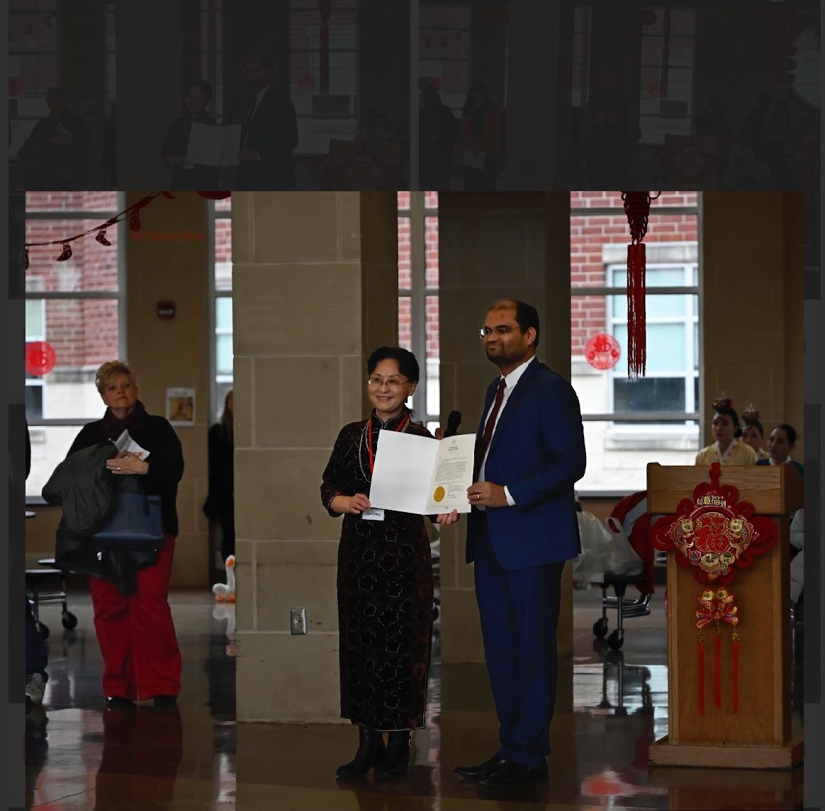 活动的成人主持人,Upper Dublin本土居民,知名钢琴家范聪博士也逐一向观众介绍了到场嘉宾。宾州政府亚太事物委员会主任Razin Karu现场宣读了州长Josh Shapiro的庆祝农历新年致辞。