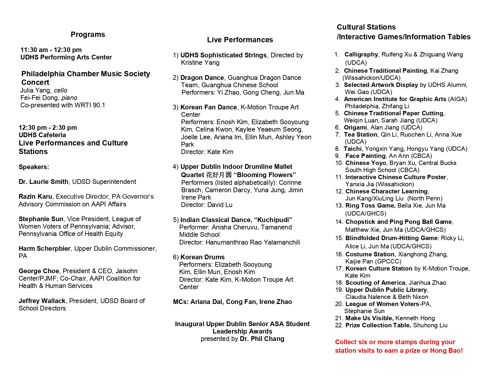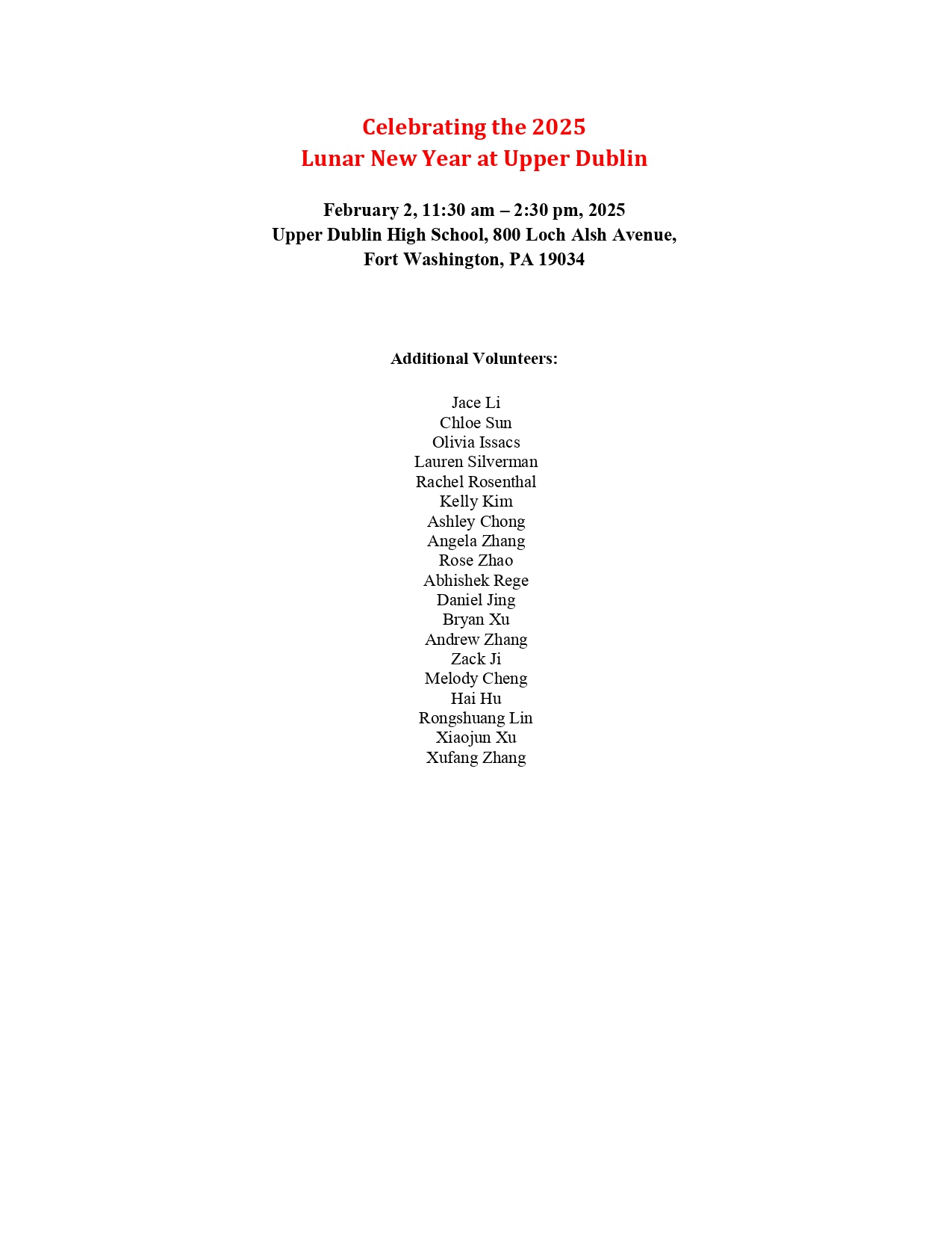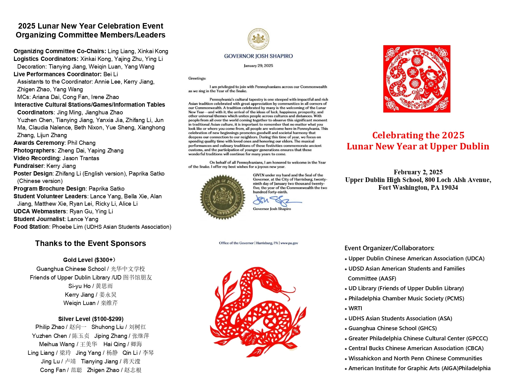 这次UD春节活动有多家社团联合协助举办,包括朱雅静博士(也是UD华协副会长)与Phil Chang博士 (高中副校长)担任共同主席的UD学区亚裔美国人学生和家庭委员会,Upper Dublin公共图书馆,光华中文学校,大费城华人文化中心,中博华人协会, Wissahickon and North Penn 华人社团, 以及美国平面艺术协会(AIGA)费城分会。