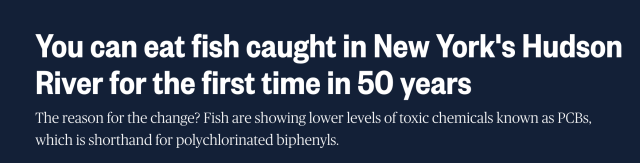 纽约州卫生官员表示,此次放宽限制的关键原因,是鱼体内多氯联苯(PCBs)含量显著下降。这类曾广泛存在于工业污染中的有毒化学物质,长期以来是限制哈德逊河渔获食用的主要原因。卫生专家奥黛丽·范·吉内赫滕指出,如今“一些鱼体内的PCBs浓度已经降低到足以让家庭——甚至包括年轻女性和儿童——适量食用的水平”。