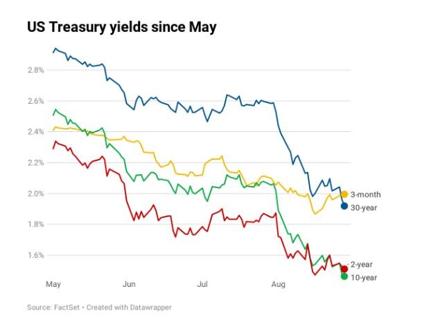 据CNBC报道,基准30年期美国国债的利率在周三跌至新的历史低点,使得美债收益率“倒挂”更加严重。这是由于固定收益投资者继续押注温和的通胀和全球增长放缓。周三早盘30年期美债收益率跌至1.907%,打破8月早些时候创下的1.916%历史新低。30年期利率后来从那些低点回升至1.916%,但仍然低于期限较短的美债收益率,如3个月和1个月期的美债。