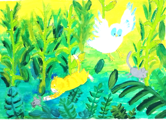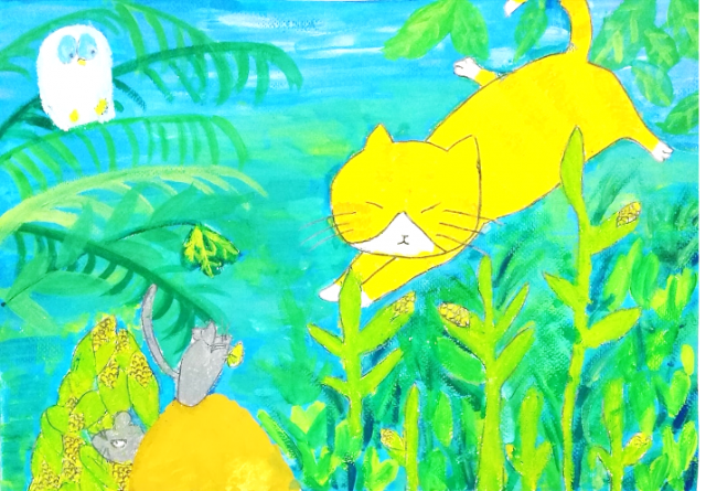 张语吟,女,时年10岁,就读于浙江省慈溪市慈吉小学四年级。喜爱画画,这是我第一次参加插画故事。我喜欢这个小故事,小猫可爱懂事、猫妈妈宽容慈爱、猫头鹰妈妈乐于助人。希望通过我的插画,能让大家更好地理解这个故事,也希望大家喜欢我的画。