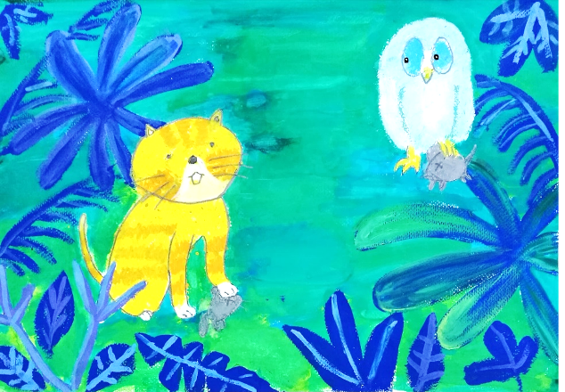 《猫头鹰和猫》 徐若一 画(时年7岁)