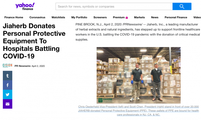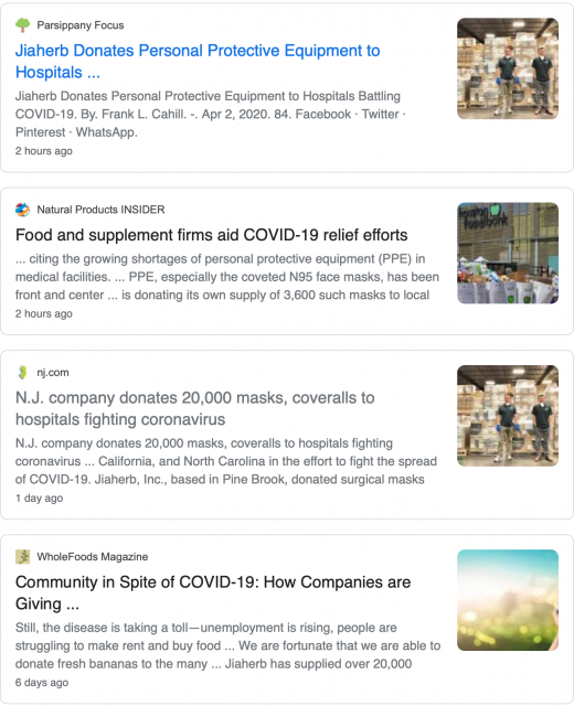 JIAHERB给新泽西本地的医院Morristown Medical Center (属于ALTANTIC HEALTH SYSYTEM )捐赠了2000套防护服和5000个口罩。另外的捐赠给了位于加州和北卡的两家医院。