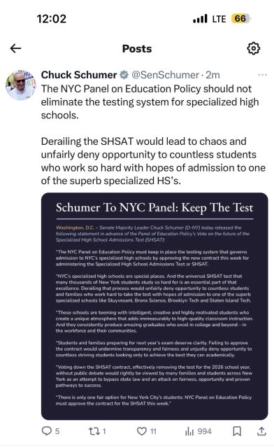 在没有公开辩论的情况下,投票否决SHSAT合同,实际上取消了2026学年的考试,这将被纽约州许多家庭和学生正确地视为试图绕过州法律,并攻击公平机会和公认的成功途径。