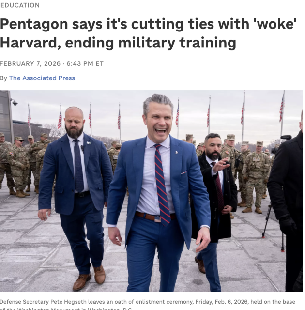 赫格塞斯随后在社交平台 X 上发文称:“哈佛大学已经觉醒,而战争部还没有。”他还发布视频宣布,从2026—2027学年起,五角大楼将停止所有在哈佛开展的研究生级专业军事教育、奖学金和证书项目。五角大楼表示,目前正在哈佛就读的军人将被允许完成现有课程,学术合作关系将在今年秋季逐步结束。