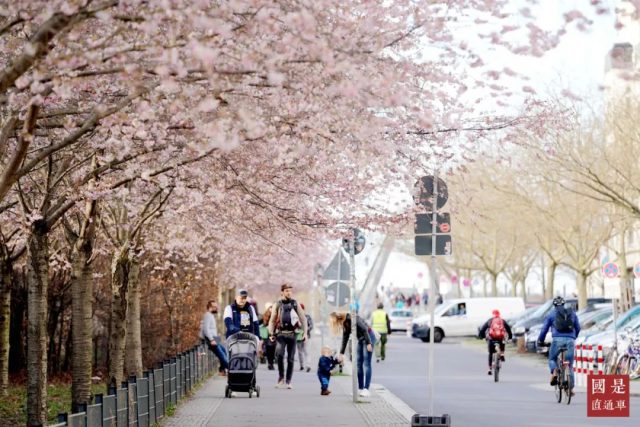 3月16日,人们在柏林的“樱花大街”施韦特街享受春日暖阳。中新社记者 彭大伟 摄