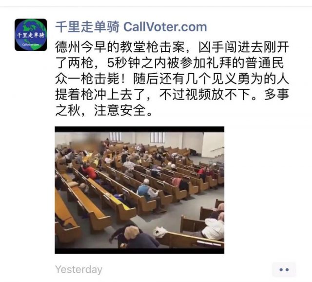 昨天我发了个朋友圈,把老英雄在德州教堂一枪击毙歹徒的视频贴了出来。好么,点赞加回复能有好几百!还有不少网友转发,然后转来转去,又有人当新闻素材 发给了我。