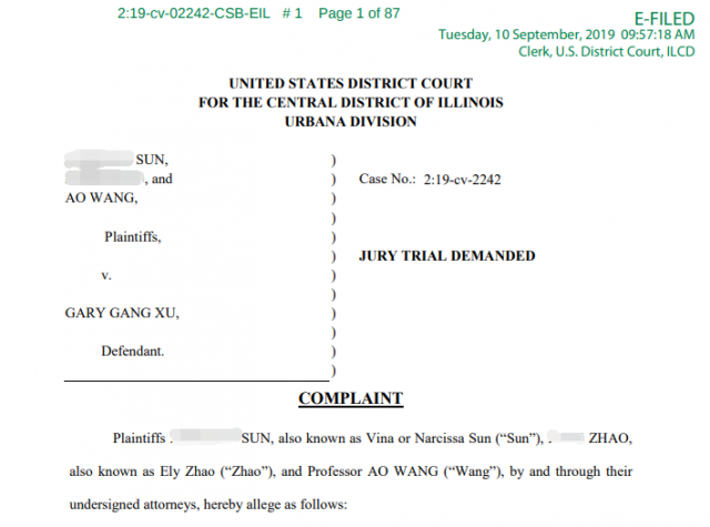 据报道,9月11日,美国 伊利诺伊大学香槟分校 (UIUC)的两名前学生和另一所学校的教授,对前UIUC终身教授Gary Gang Xu(以下称Gary Xu)提起诉讼,声称他曾 多次性侵,殴打、威胁多名中国女留学生 。目前,Gary Xu暂未有回复,但此前他曾全盘否认涉性交易行为。