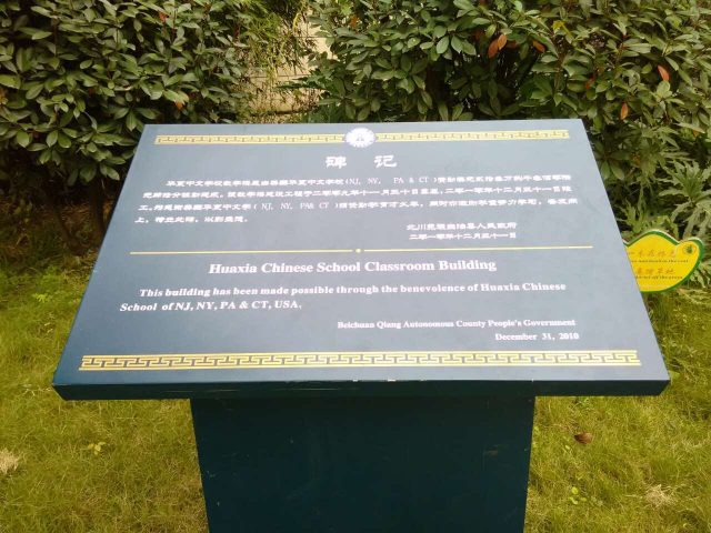 碑文记载:“为感谢美国华夏中文学校(NJ, NY, PA & CT) 捐资助学育才义举,同时亦激励学童努力学习,奋发向上,特立此碑,以彰盛德。”—北川羌族自治县人民政府 二零一零年十二月三十一日”’