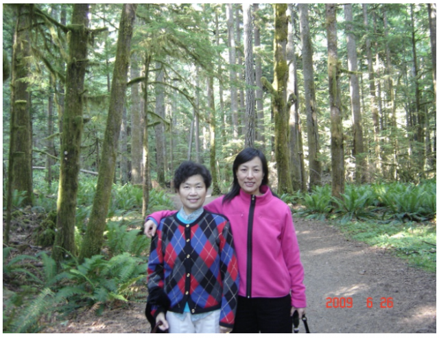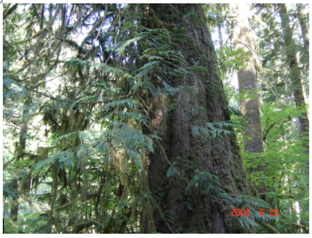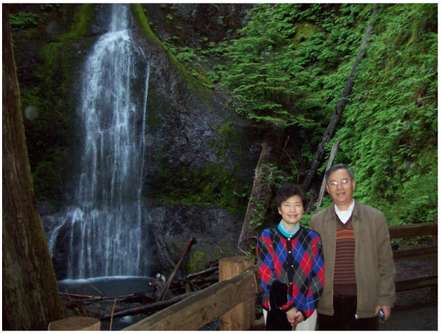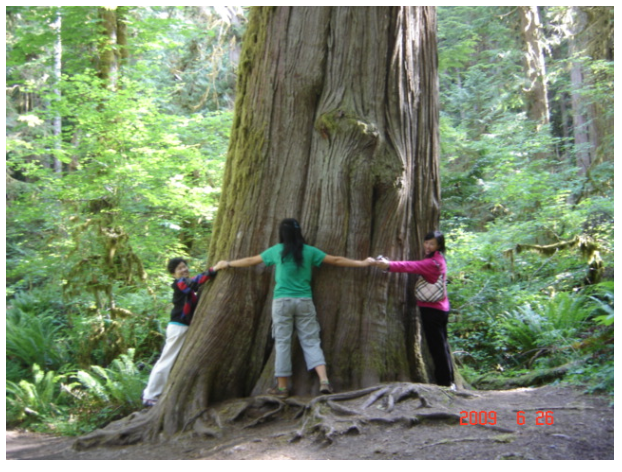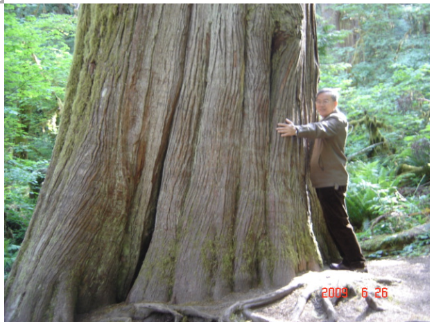 我们沿着这条在森林中曲曲弯弯的小路,闻听着那远处隐隐约约传来的潺潺流水声,去寻找瀑布。西雅图的气候特点是潮湿多雨。在奥林匹克国家森林公园面临太平洋一侧的西南面山地,年降雨量可以达到134英寸(3350毫米),将近上海地区年降雨量的三倍。因此,森林茂密,植被丰富,显露出热带雨林的植被特征。令人称奇的是那些红松长得笔直笔直,20-30米高的树干居然没有丝毫弯曲。可以毫不夸张地说,只要把树皮剥去,不需要加工,就是一根可以做立柱用的栋梁之材。那些枝干高大粗壮,3-4人合抱的大树比比皆是,路边最粗的一颗,需要我们6人手指搭着手指勉强才能合抱,看上去树干苍劲,树皮上长满了青苔,也许已经千年风霜雨雪,依然生机勃勃。真不知道它能再活多少年?这么粗的大树我还是第一次见到。比我在中国杭州附近的天目山,看到过的一颗已经枯死的大树王还要粗。估计密林深处还有比这棵树更粗的大树,藏在山中无人识。那天的天气是西雅图难得的好天气,阳光透过密密的松针,好似一道道探照灯的光柱,洒落在密林深处,落到大树下部形形色色的灌木草丛上。随着树冠上枝叶的摇曳,光柱下的花草忽明忽暗,令人赞叹大自然天工造物,真是变幻无穷。