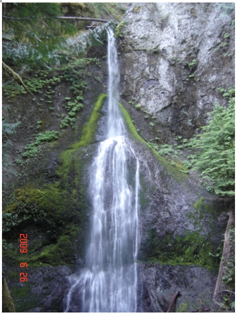 架在山溪峡谷上的桥梁是真正的独木桥。就是用一棵原木削出一个平面,当作桥面,周围的栏杆都是就地取材的树干搭成。由于树干粗壮,走在独木桥上,你感到很安全,不会有胆战心惊的感觉。走过两个独木桥,爬上一个小山坡,终于不远处传来瀑布的轰鸣声。一道白色的水帘从悬崖上挂下。水流不大,由于落差高,再加上有两处山石形成的台阶阻水,使一道瀑布形成三个跌水,溅起白色的水雾,景象也很生动,有一点李白描写庐山瀑布“飞流直下三千尺,疑是银河落九天”的味道,难怪这个瀑布在美国瀑布排行榜上属于四星级。