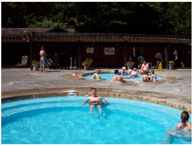 公园的管理部门,在温泉出流处修建了浴池,供游客泡澡。我和小李以及他的子女进入温泉浴室,享受了一个小时的温泉澡。收费倒是不贵,成年人11元,老年人和儿童可以优惠,每人8元。温泉的设施很简单,三个不大的圆形露天温泉浴池,一个在维修,其他两个温泉水的水温分别控制在华氏101度和104度(39°C和41.5°C),散发着温泉特有的浓郁刺鼻的气味。有二三十人在阳光烤晒中泡温泉。温泉池旁还有一个冷水游泳池,先在温泉池中把身体皮肤温度提高,再跳入冷水游泳池中游泳,或者反过来,游泳后再泡温泉。这是美国式的温泉文化,粗犷方式的享受。