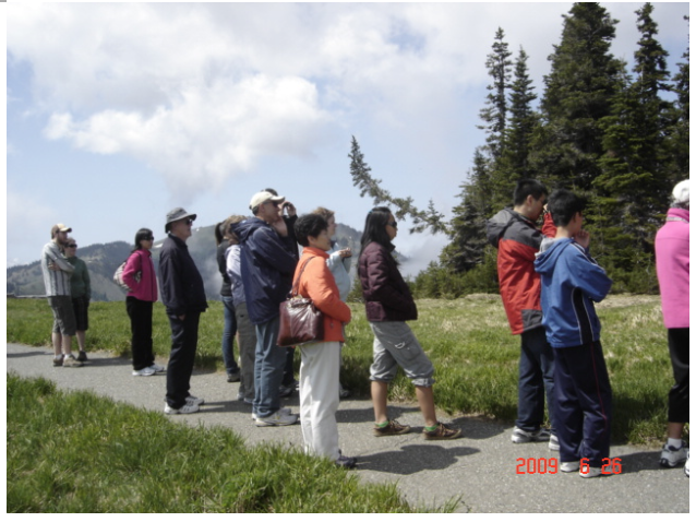 奥林匹克国家森林公园旅游的最后一站是台风崖(Hurricane Ridge)。台风崖海拔约5600英尺(约1680米),小李开着面包车沿着蜿蜒的山路从海边开始,一路往上爬坡(坡度为7%),半个小时后,汽车直接登上了顶峰的停车场。一路上可以看到随着海拔升高,车外气温从75华氏度下降到55华氏度,植被有明显的变化。原本茂密的树林逐渐稀疏,开始出现高山草甸风光。